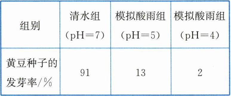 6. 下表所示是小明探究“酸雨对黄豆种子萌发的影响”时的实验数据。下列有关叙述正确的是(