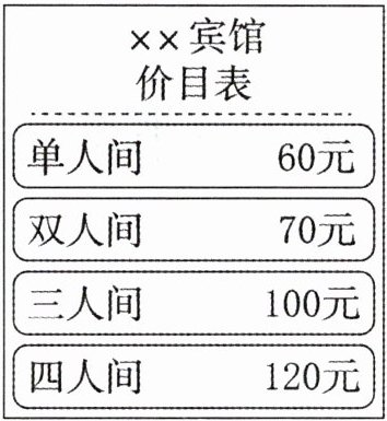 1. 王老师(女)带 6 名女生和 14 名男生到外地参加比赛,需要入住宾馆。下面是宾馆房间的价目表,他们怎样安排住宿最合算? 共花多少元? (男、女分开住)