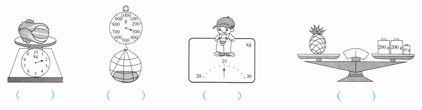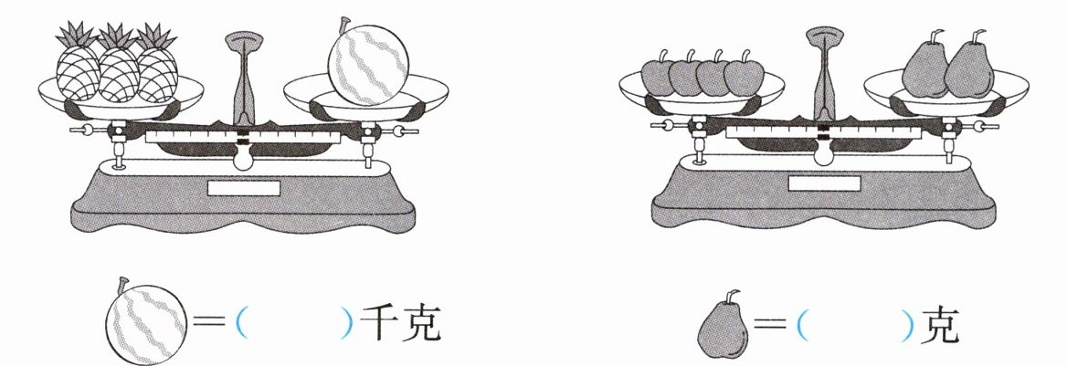 2. 下面这些水果,怎样放才能使天平处于下面的两种状态?(填序号,物品不能重复使用)