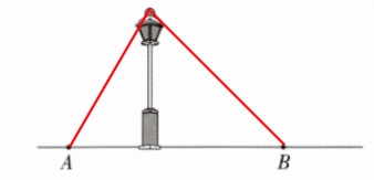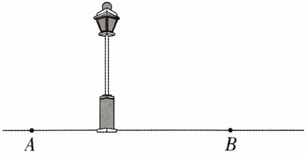 2. 如图,晚上明明在路灯下散步,由点 $ A $ 走向点 $ B $,画出在 $ A $,$ B $ 两点他看路灯的视线与路灯灯柱形成的角,并比较这两个角的大小。