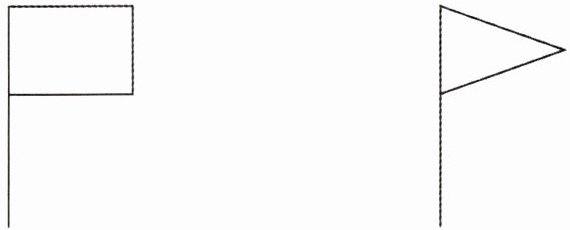 综上,左图:直角为旗面的4个角,平行线为旗面对边,垂线为旗杆与旗面底边及侧边;右图:锐角为旗面顶角,钝角为旗面另外两个角,垂线为旗杆与旗面底边。