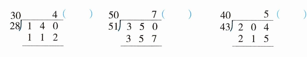$\begin{array}{r }30\\ 28\overline{)140}\\ \underline{112}\\ 28\end{array}$ 4() $\begin{array}{r }50\\ 51\overline{)350}\\ \underline{357}\\ \end{array}$ 7() $\begin{array}{r }40\\ 43\overline{)204}\\ \underline{215}\\ \end{array}$ 5()