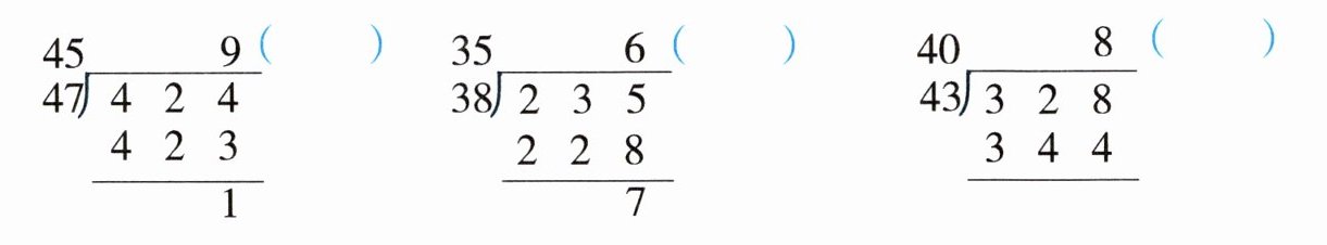 $ \begin{array}{r} 45 \\ 47\enclose{longdiv}{424} \\ 423 \\ \hline 1 \end{array} ($$) \begin{array}{r} 35 \\ 38\enclose{longdiv}{235} \\ 228 \\ \hline 7 \end{array} ($)