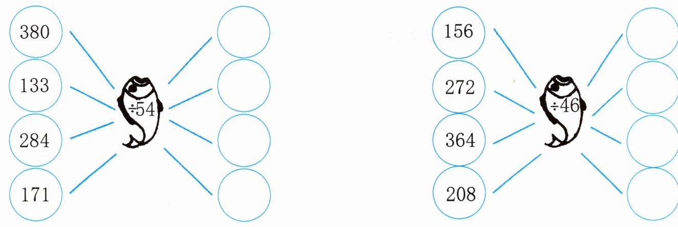 $ \begin{array}{c} \begin{matrix} \textcircled{156} \\ \textcircled{272} \\ \textcircled{364} \\ \textcircled{208} \end{matrix} \begin{matrix} \\ \begin{matrix} \put(0, - 12){\rotatebox{90}{$\leftarrow$}} \put(0, - 12){\hspace{0.5cm}\textcircled{$÷ 46$}} \end{matrix} \\ \\ \end{matrix} \begin{matrix} \textcircled{} \\ \textcircled{} \\ \textcircled{} \\ \textcircled{} \end{matrix} \end{array} $