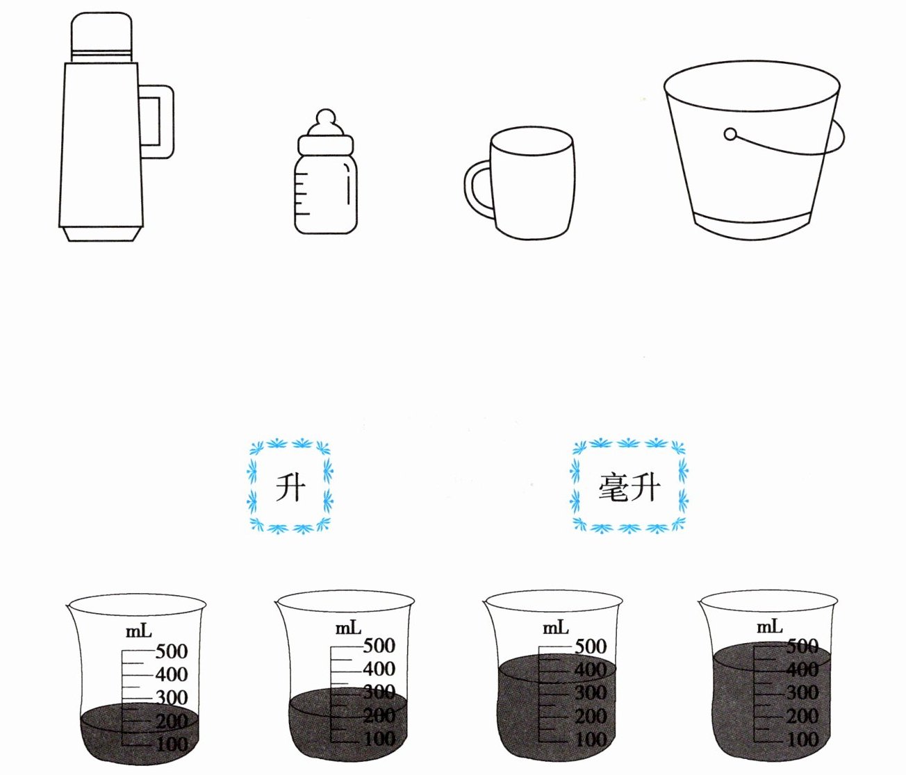 保温瓶——升;奶瓶——毫升;杯子——毫升;桶——升。