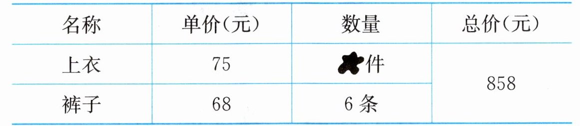 5. 刘阿姨批发服装时,不小心把发票弄脏了,你能帮她算出上衣的数量吗?(4 分)