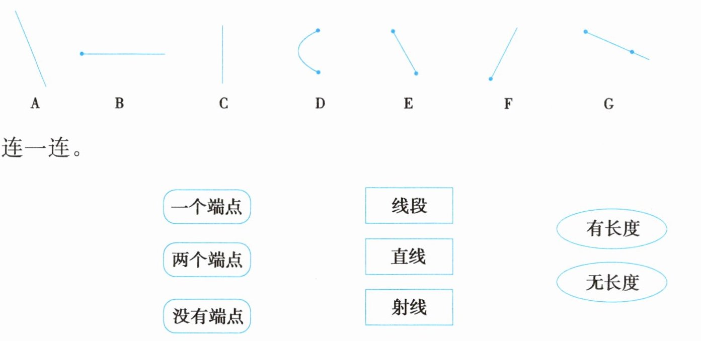 一个端点—射线;两个端点—线段;没有端点—直线;线段—有长度;直线—无长度;射线—无长度