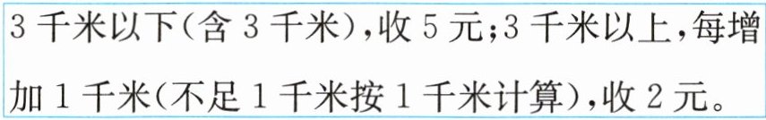 3 千米以下(含 3 千米),收 5 元;3 千米以上,每增加 1 千米(不足 1 千米按 1 千米计算),收 2 元。
