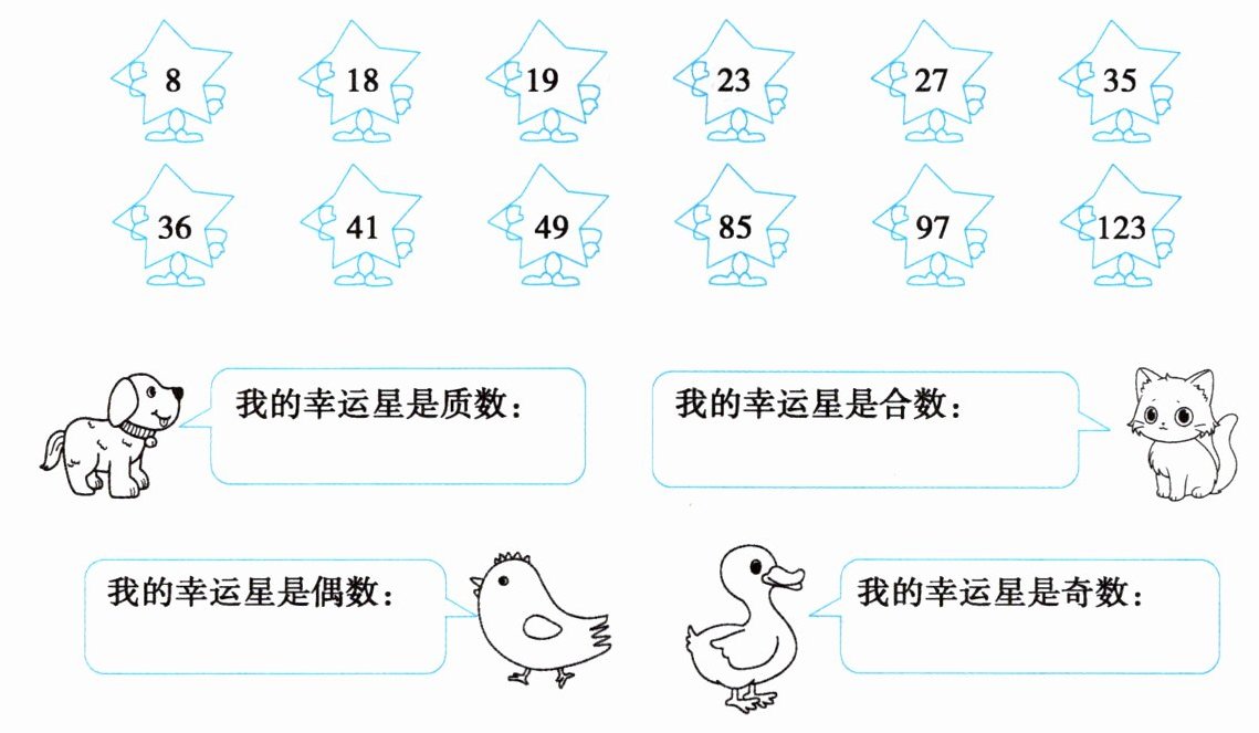 我的幸运星是质数:19,23,41,97;我的幸运星是合数:8,18,27,35,36,49,85,123;我的幸运星是偶数:8,18,36;我的幸运星是奇数:19,23,27,35,41,49,85,97,123;思考:偶数中有质数(2是唯一的偶质数,本题中偶数均为合数);不是所有的奇数都是质数。