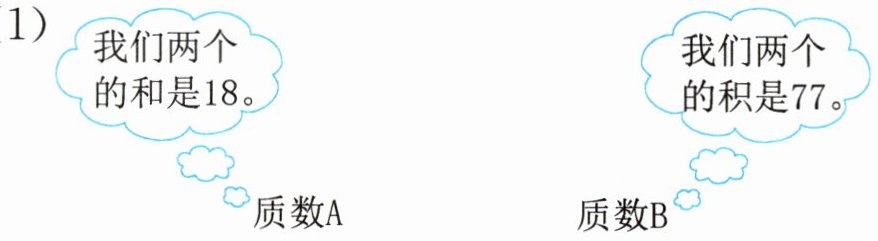 (1)质数A和质数B的和为18,积为77。将77分解质因数:77=7×11,且7+11=18,故A=7,B=11(或A=11,B=7)。