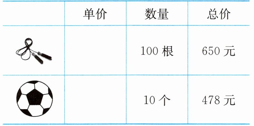 2. 学校购买了下列体育用品,数量和总价如下表。计算出每种体育用品的单价,并填入表中。