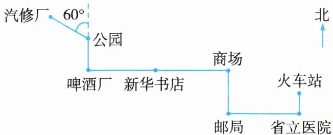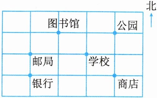 商店在邮局的()偏()()°方向,图书馆在商店的()偏()()°方向,邮局在公园的()偏()()°方向,学校在银行的()偏()()°方向。