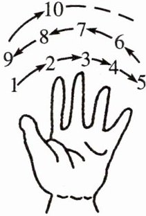 10. 伸出你的左手,从大拇指开始如下图所示的那样数数,当数到$2018$时,你数的数在哪个手指上?