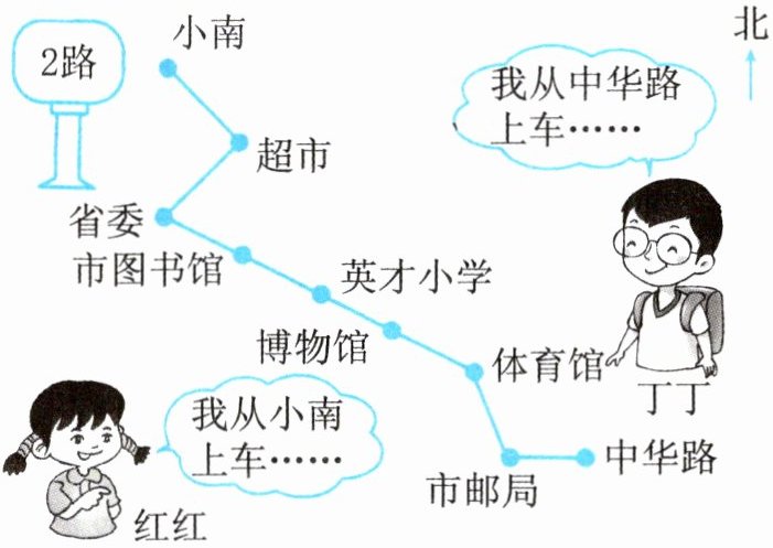 )站。(2) 丁丁从中华路上车,向(