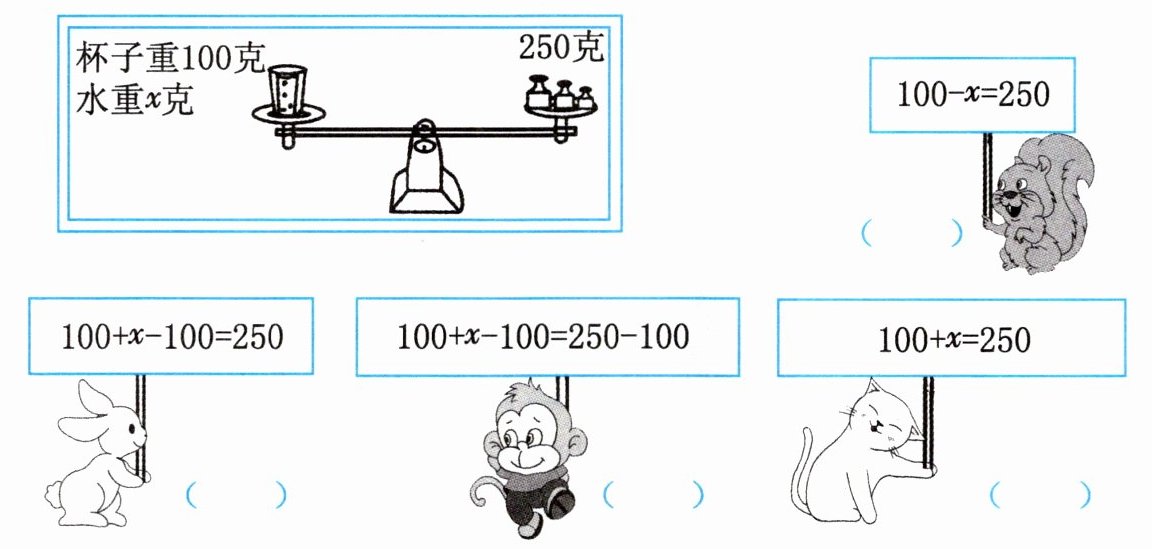 1. 小动物们根据下图写等式。谁的等式成立?请你给它画“√”。