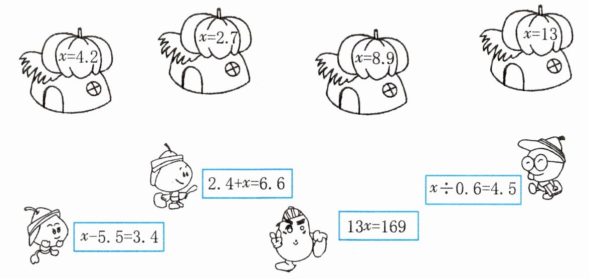 所以匹配结果为:$x = 4.2$对应的房子与$2.4 + x = 6.6$的卡通人物相连;$x = 2.7$对应的房子与$x÷0.6 = 4.5$的卡通人物相连;$x = 8.9$对应的房子与$x - 5.5 = 3.4$的卡通人物相连;$x = 13$对应的房子与$13x = 169$的卡通人物相连。