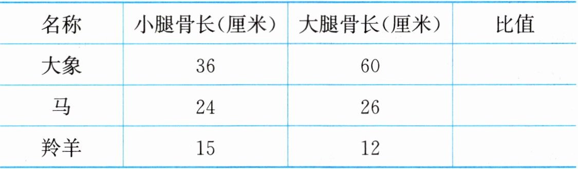 5. 有关资料显示,动物的小腿骨与大腿骨长度的比值越大,这种动物跑得越快。下表是几种动物的小腿骨与大腿骨长度的参考数值,试比较哪种动物跑得最快。