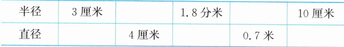 | 半径 | 3厘米 | 2厘米 | 1.8分米 | 0.35米 | 10厘米 |