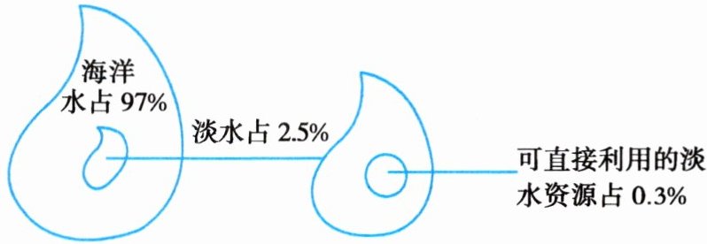 6. 地球上的水,97%是海洋水,而人类所需要的淡水资源仅占全球水量的2.5%,而在这2.5%的淡水资源中,冰川、深层地下水占98%,可直接利用的淡水资源仅占0.3%,如图所示。你能说明这组数据所表示的意义吗?你从中有什么感悟吗?