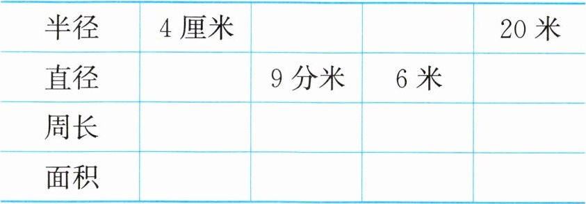 | 半径 | 4 厘米 | 4.5 分米 | 3 米 | 20 米 |