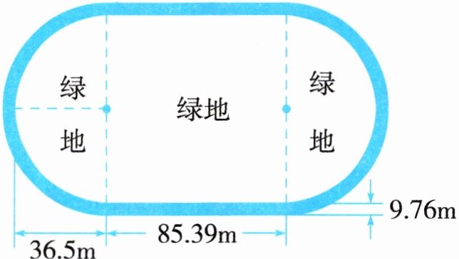 7. 某中学计划在操场上建一个总长 400 米、宽度 9.76 米的塑胶跑道,已知内圈的长是 400 米,中间是绿地。示意图如下。
