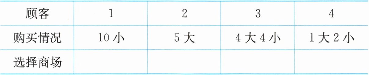 7. 天气渐渐热了,购买饮料的人越来越多。因此,甲、乙、丙三个商场都进了一批相同的饮料:每大瓶10元,每小瓶2.5元。为了抢占市场,三个商场分别推出优惠措施,甲商场:买大瓶送小瓶;乙商场:一律打九折;丙商场:满30元打八折。下表是4位顾客的购买情况,这些顾客去哪个商场购买才会花钱最少? 请你给出建议并填在表中。