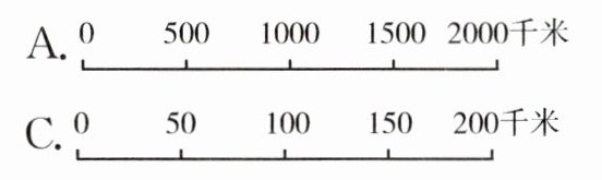 )是这幅图的线段比例尺。A.$ 0 \quad 500 \quad 1000 \quad 1500 \quad 2000 $千米