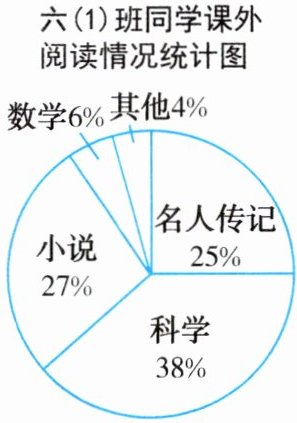 4. 六(1)的学习委员李博文对班上同学课外阅读的情况进行调查,他调查的问题是:“你最喜欢哪一类课外书?”根据同学们的回答,他制成下面的扇形统计图。请你看图回答下面的问题。