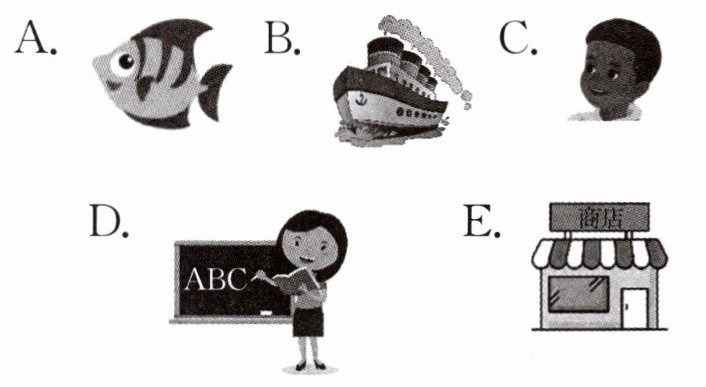1. English 2. short 3. ship 4. shop 5. fish, shell(1. D 2. C 3. B 4. E 5. A)