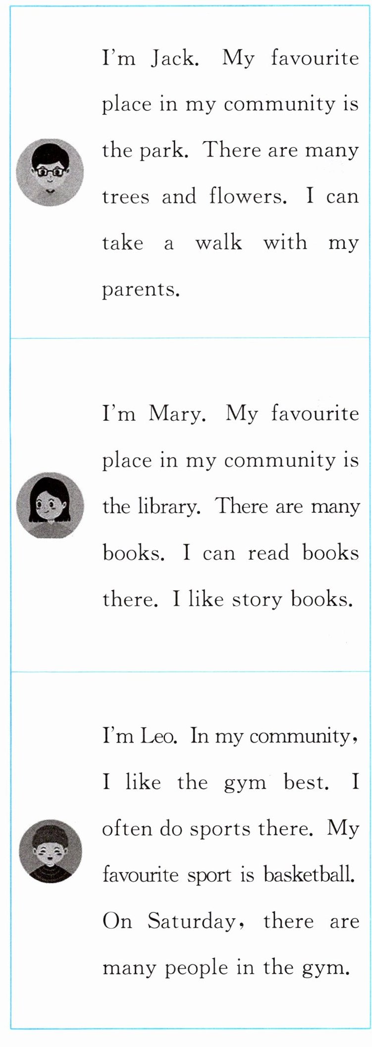 I'm Jack. My favourite place in my community is the park. There are many trees and flowers. I can take a walk with my parents.