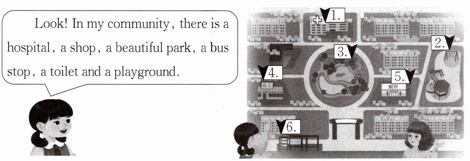 1. hospital 2. playground 3. park 4. shop 5. toilet 6. bus stop