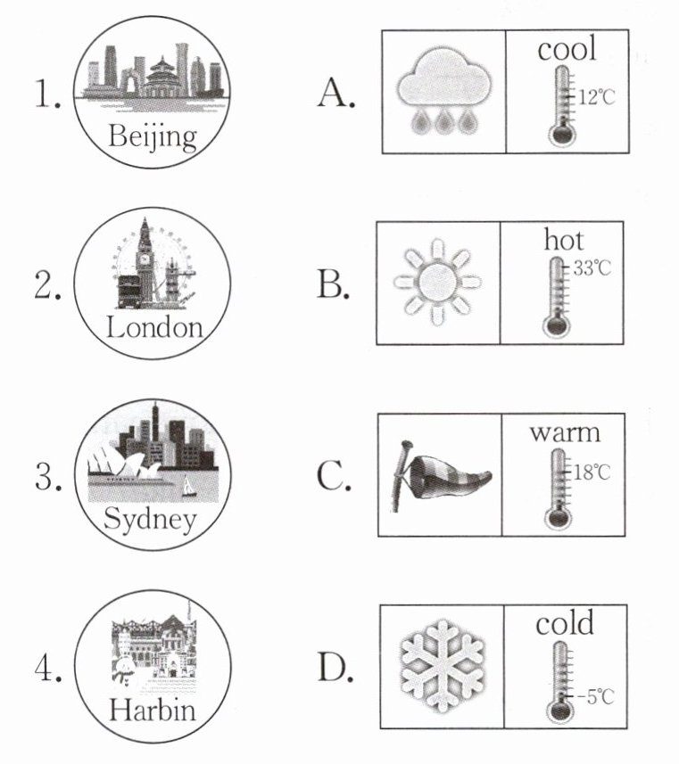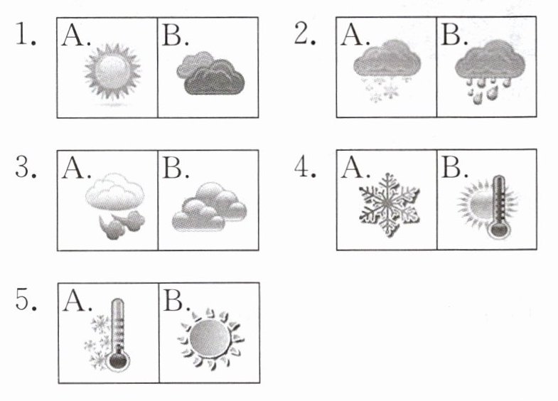 1. warm,sunny 2. cold,snowy 3. cool,rainy 4. hot,cloudy 5. cold,rainy