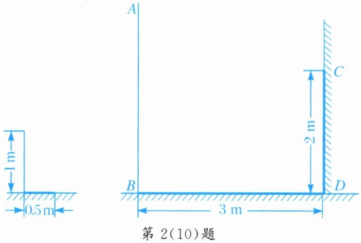 (10) 如图,一电线杆$AB$的影子分别落在了地上和墙上,某一时刻,小明竖起$1\ m$高的直杆,量得其影长为$0.5\ m$,此时,他又量得电线杆$AB落在地上的影子BD的长为3\ m$,落在墙上的影子$CD的高为2\ m$. 小明用这些数据很快算出了电线杆$AB$的高. 请你计算,电线杆$AB$的高为(