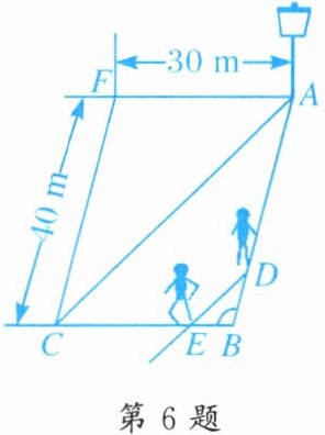 6. 如图,在一个长是$40\ m$、宽是$30\ m$的长方形小操场上,王刚从点$A$出发,沿着$A\to B\to C的路线以3\ m/s的速度跑向点C$. 当他出发$4\ s$后,张华有东西需要交给他,就从点$A$出发沿王刚走的路线追赶,当张华跑到距点$B\ 2\frac{2}{3}\ m的点D$处时,他和王刚在阳光下的影子恰好在同一条直线上. 此时,$A处一根电线杆在阳光下的影子也恰好落在对角线AC$上.