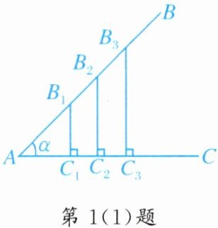 (1) 如图,若任意给定一个锐角 $\alpha$,在 $AB$ 边上取点 $B_1$,$B_2$,$B_3$,过点 $B_1$,$B_2$,$B_3$ 作 $AC$ 的垂线,垂足分别为 $C_1$,$C_2$,$C_3$,那么 $\frac{B_1C_1}{AC_1}$,$\frac{B_2C_2}{AC_2}$,$\frac{B_3C_3}{AC_3}$ 的值相等吗?