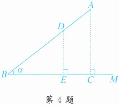4. 如图,$AB$为斜坡,$D是斜坡AB$上一点,斜坡$AB的坡度为i$,坡角为$\alpha$,$AC \perp BM于点C$,下列式子中正确的有(