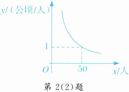 (2) 某村耕地总面积为 $ 50 $ 公顷,该村人均耕地面积 $ y $ (公顷/人) 与总人口 $ x $ (人) 的函数图像如图所示,则下列说法中正确的是 (