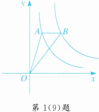 函数。(9)如图,A是反比例函数$y_1 = \frac{1}{x}(x > 0)$图像上一点,过点A作x轴的平行线,交反比例函数$y_2 = \frac{k}{x}(x > 0)$的图像于点B,连接OA,OB。若$\triangle OAB$的面积为2,则k的值为5