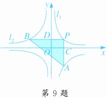 9. 如图,两个反比例函数 $y = \frac{1}{x}$ 和 $y = -\frac{2}{x}$ 的图像分别是 $l_1$ 和 $l_2$. 设点 $P$ 在 $l_1$ 上,$PC \perp x$ 轴,垂足为 $C$,$PC$ 交 $l_2$ 于点 $A$;$PD \perp y$ 轴,垂足为 $D$,$PD$ 交 $l_2$ 于点 $B$,则 $\triangle PAB$ 的面积为(
