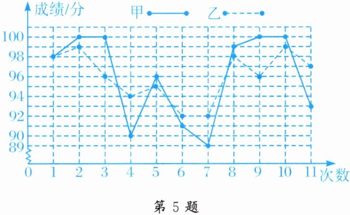 5. 甲、乙两名同学本学年 11 次数学单元测验成绩(均为整数)的统计如图所示: