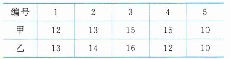 4.解:$\overline {x}_{甲}=\frac {1}{5}×(12+13+15+15+10)=13(cm).$$\overline {x}_{乙}=\frac {1}{5}×(13+14+16+12+10)=13(cm).$$s_{甲}^{2}=\frac {1}{5}×[(12-13)^{2}+(13-13)^{2}+(15-13)^{2}+(15-13)^{2}+(10-13)^{2}]=3.6(cm^{2}),$$s_{乙}^{2}=\frac {1}{5}×[(13-13)^{2}+(14-13)^{2}+(16-13)^{2}+(12-13)^{2}+(10-13)^{2}]=4(cm^{2}),$