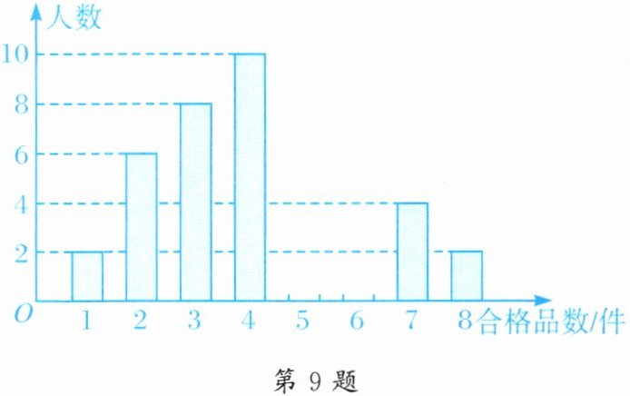 9. 某厂为了解工人在单位时间内加工同一种零件的技能水平,随机抽取了 50 名工人加工的零件进行检测,统计出他们各自加工的合格品数是 1 到 8 这八个整数,现提供统计图的部分信息如图,请解答下列问题: