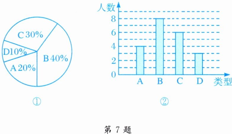 7. 某校 $260$ 名学生参加植树活动,要求每人植 $4\sim7$ 棵,活动结束后随机抽查了 $20$ 名学生每人的植树量,并分为四种类型,$A$($4$ 棵),$B$($5$ 棵),$C$($6$ 棵),$D$($7$ 棵). 将各类的人数绘制成扇形图(如图①)和条形图(如图②),经确认扇形图是正确的,而条形图尚有一处错误.