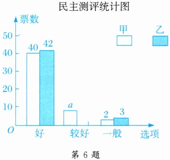 6. 九年级(一)班邀请 $A$,$B$,$C$,$D$,$E$ 五位评委对甲、乙两名同学的才艺表演打分,并组织全班 $50$ 名学生对两人进行民主测评投票,根据打分和投票情况绘制了如下的统计表和不完整的条形统计图: