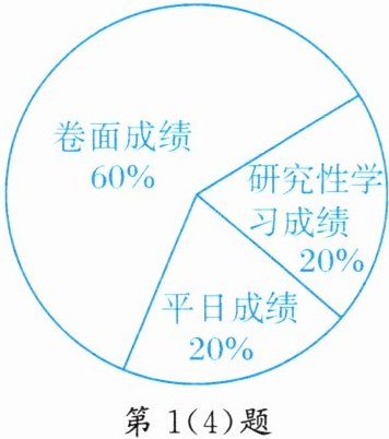 (4)某校规定:学生期末总评成绩由卷面成绩、研究性学习成绩、平日成绩三部分构成,各部分所占比例如图所示.小明本学期数学学科三部分的成绩分别是$90$分、$80$分、$85$分,则小明的数学期末总评成绩为