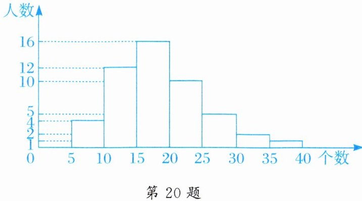 某校为了预测九年级男生“排球 30 s 对墙垫球”的情况,从本校九年级随机抽取了 $ n $ 名男生进行该项目测试,并绘制出如图所示的统计图,其中从左到右依次分为七个组(每组含最小值,不含最大值). 根据统计图提供的信息解答下列问题: