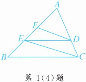 。(4)如图,在$\triangle ABC$中,$D为AC$上一点,且$\frac{CD}{AD}= \frac{1}{2}$,过点$D作DE// BC$,交$AB于点E$,连接$CE$,过点$D作DF// CE$,交$AB于点F$。若$AB = 15$,则$EF= $