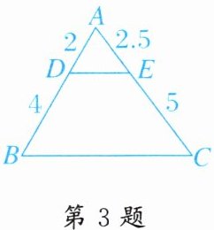 3.解:$\triangle ADE$与$\triangle ABC$相似. 理由:$\because \frac{AD}{AB}=\frac{2}{2+4}=\frac{1}{3}$,$\frac{AE}{AC}=\frac{2.5}{2.5+5}=\frac{1}{3}$,$\therefore \frac{AD}{AB}=\frac{AE}{AC}$. 又$\because \angle A=\angle A$,$\therefore \triangle ADE\backsim \triangle ABC$.