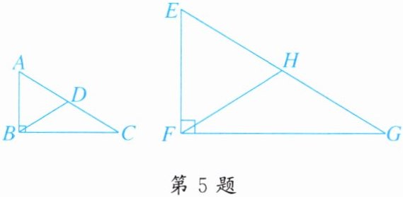 5. 如图,$Rt\triangle ABC \backsim Rt\triangle EFG$,$EF = 2AB$,$BD$ 和 $FH$ 分别是它们的中线,那么 $\triangle BDC$ 与 $\triangle FHG$ 是否相似?如果相似,试确定它们的周长比和面积比.