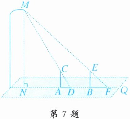 7. 晚饭后,小聪和小军在社区广场散步,小聪问小军:“你有多高?”小军一时答不上来.小聪思考片刻,提议用广场照明灯下的影长及地砖长来测量小军的身高.于是,两人在灯下沿直线$NQ$移动,如图,当小聪正好站在广场的点$A$(距点$N5$块地砖长)处时,其影长$AD恰好为1$块地砖长;当小军正好站在广场的点$B$(距点$N9$块地砖长)处时,其影长$BF恰好为2$块地砖长.已知广场地面由边长为$0.8m$的正方形地砖铺成,小聪的身高$AC为1.6m$,$MN\perp NQ$,$AC\perp NQ$,$BE\perp NQ$.请你根据以上信息,求出小军身高$BE$的长.(结果精确到$0.01m$)